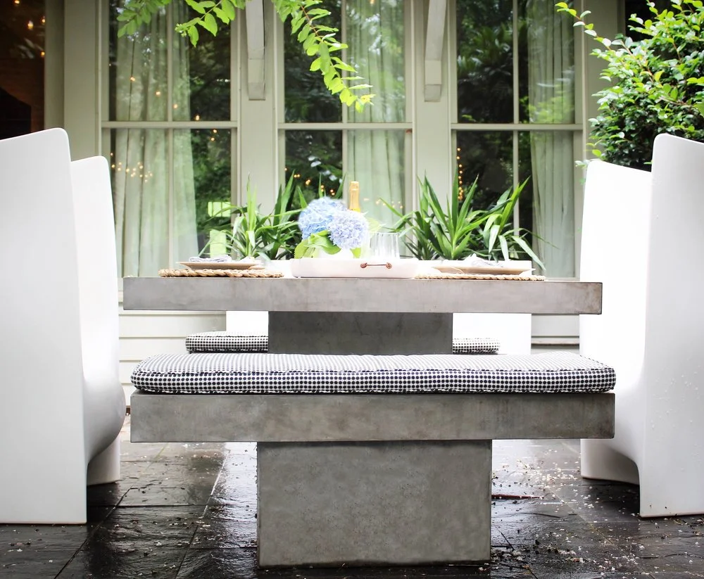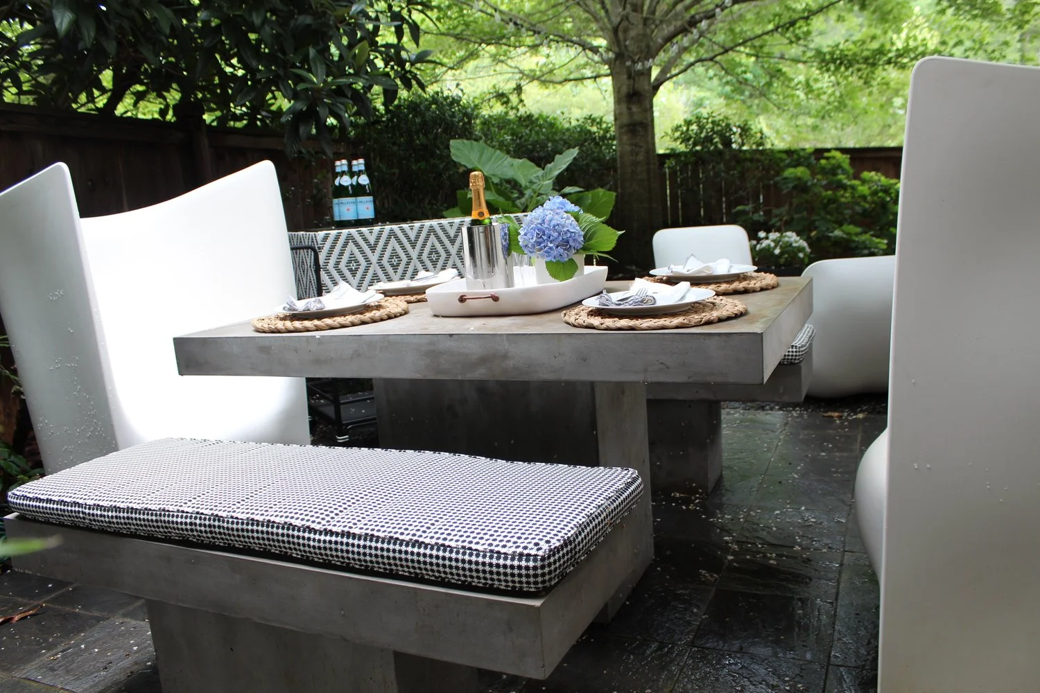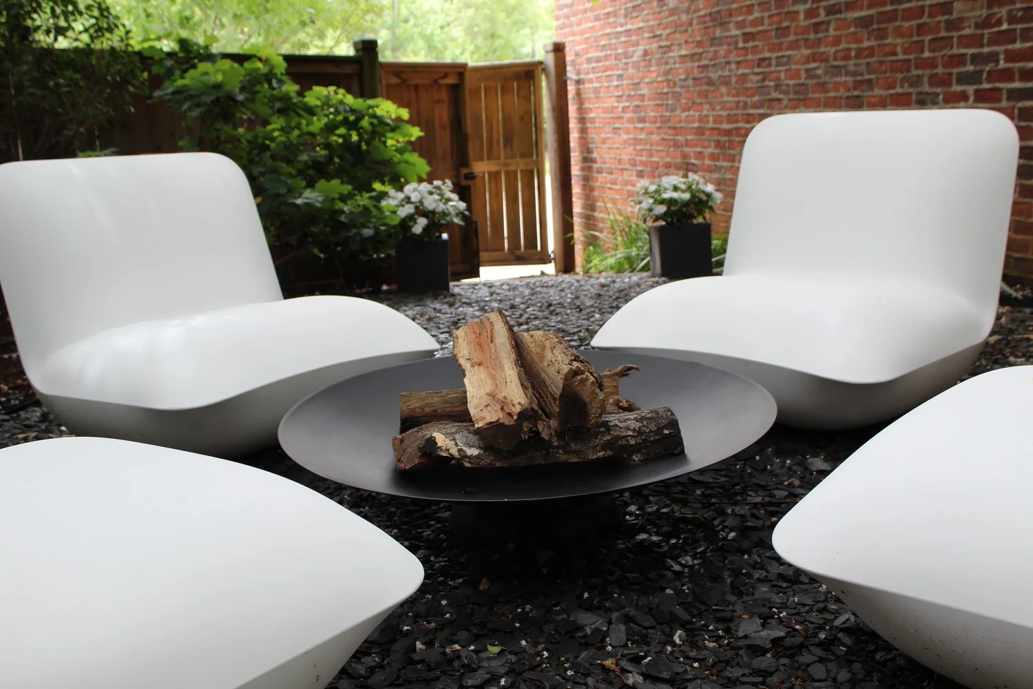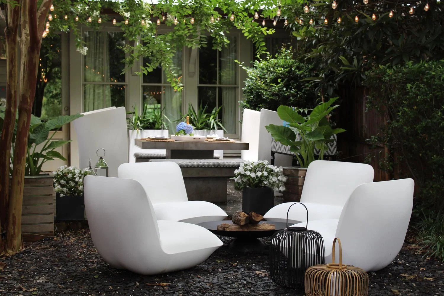 Underneath a lush canopy of greenery and nestled within a side porch sits a contemporary collection of modern seating in a small yet cozy courtyard.